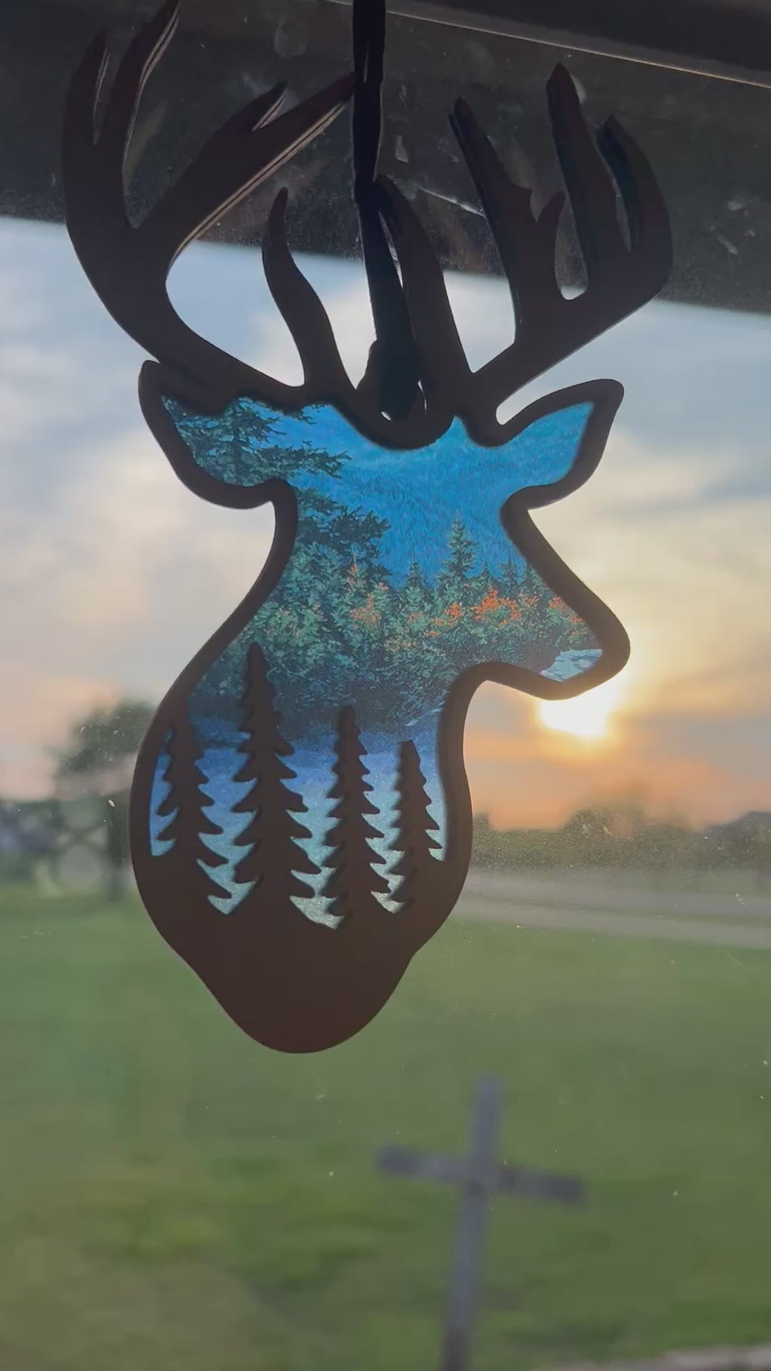 Buck Sky and Trees Suncatcher | Rustic Wooden Car Charm