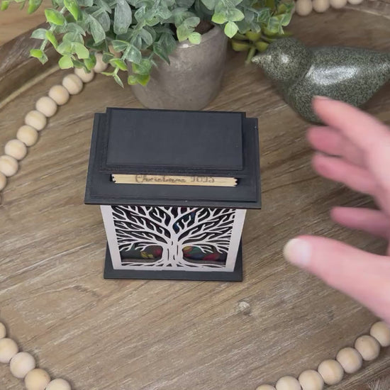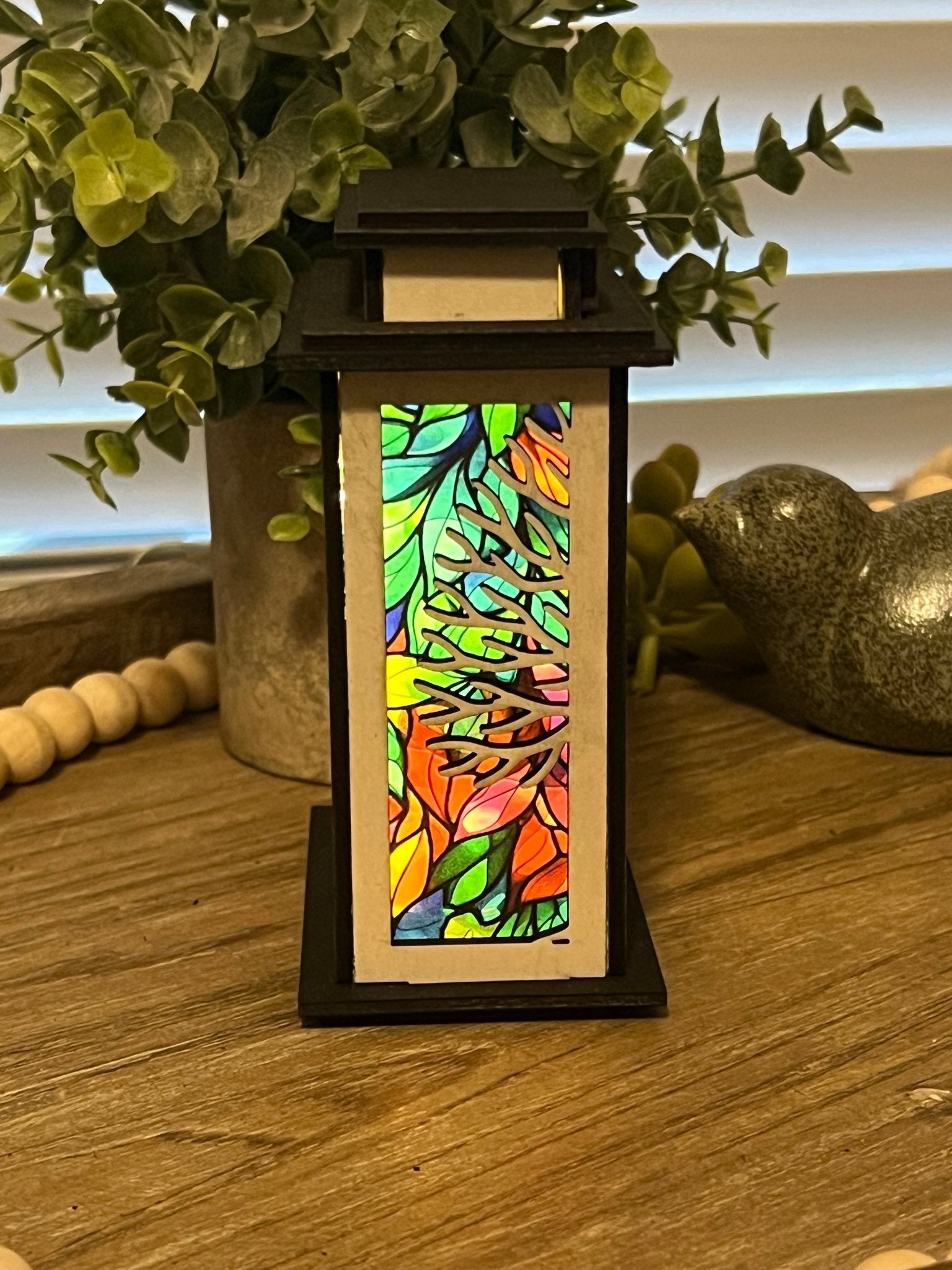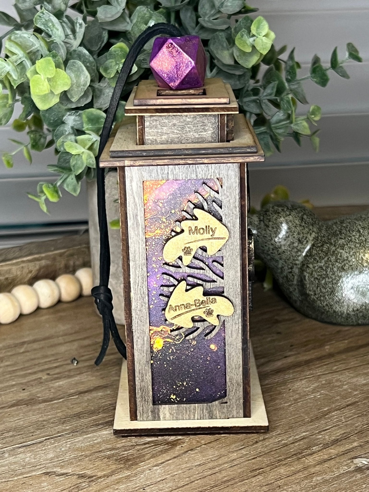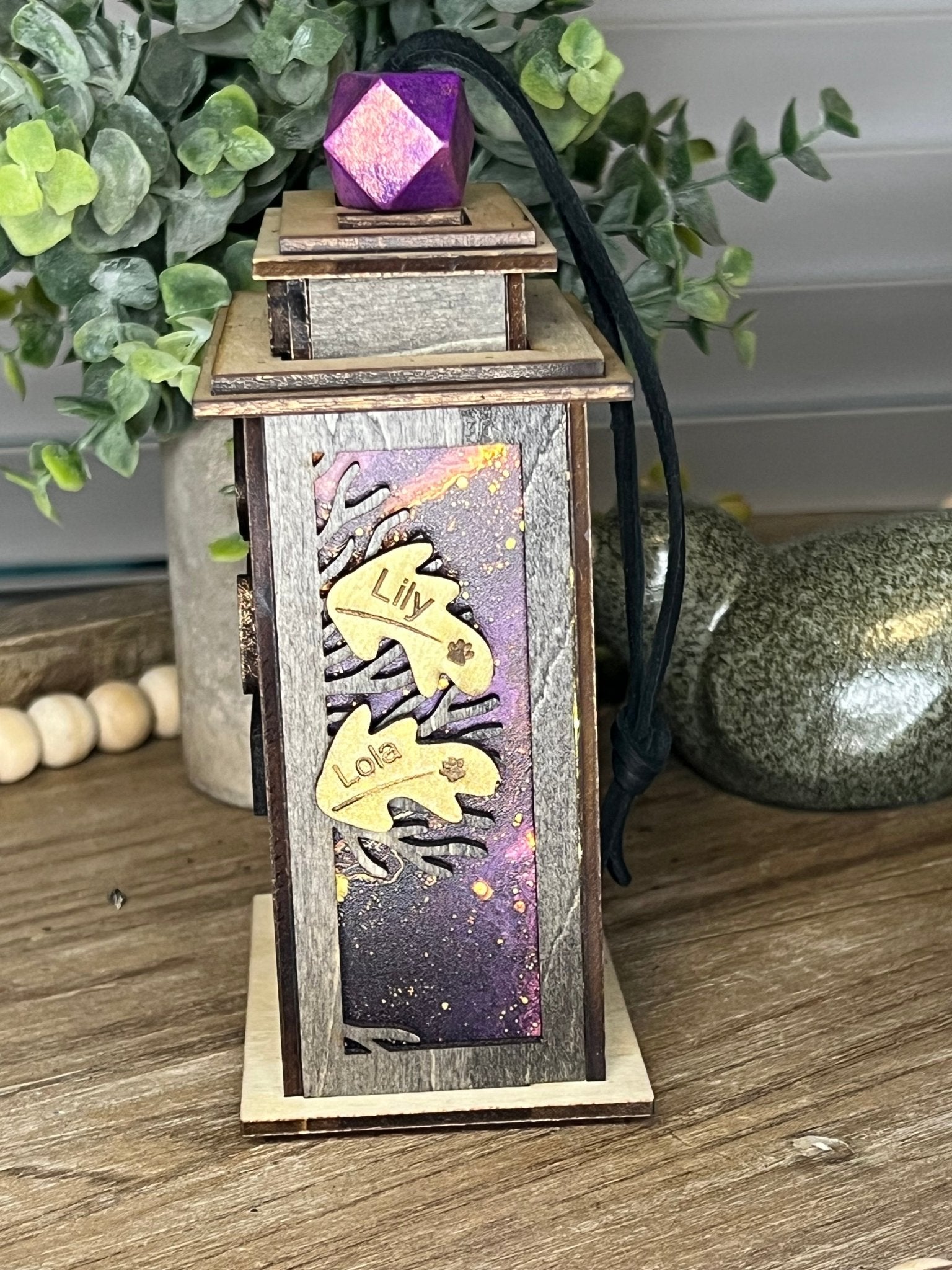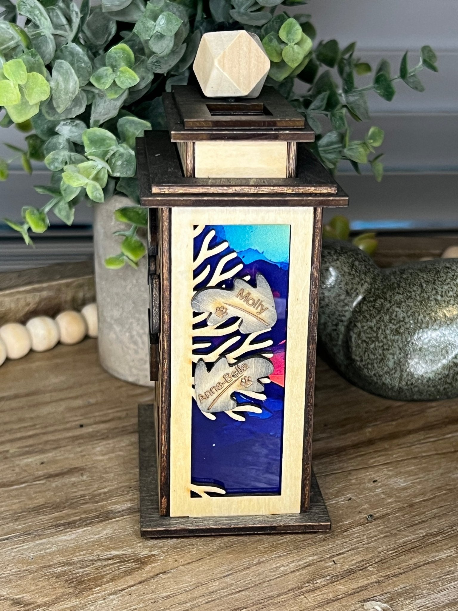 4 back of the lantern option: Blank engravable (hidden battery pack); Family tree engraving (hidden battery pack); Tea light candle option; Option for placing battery pack on back