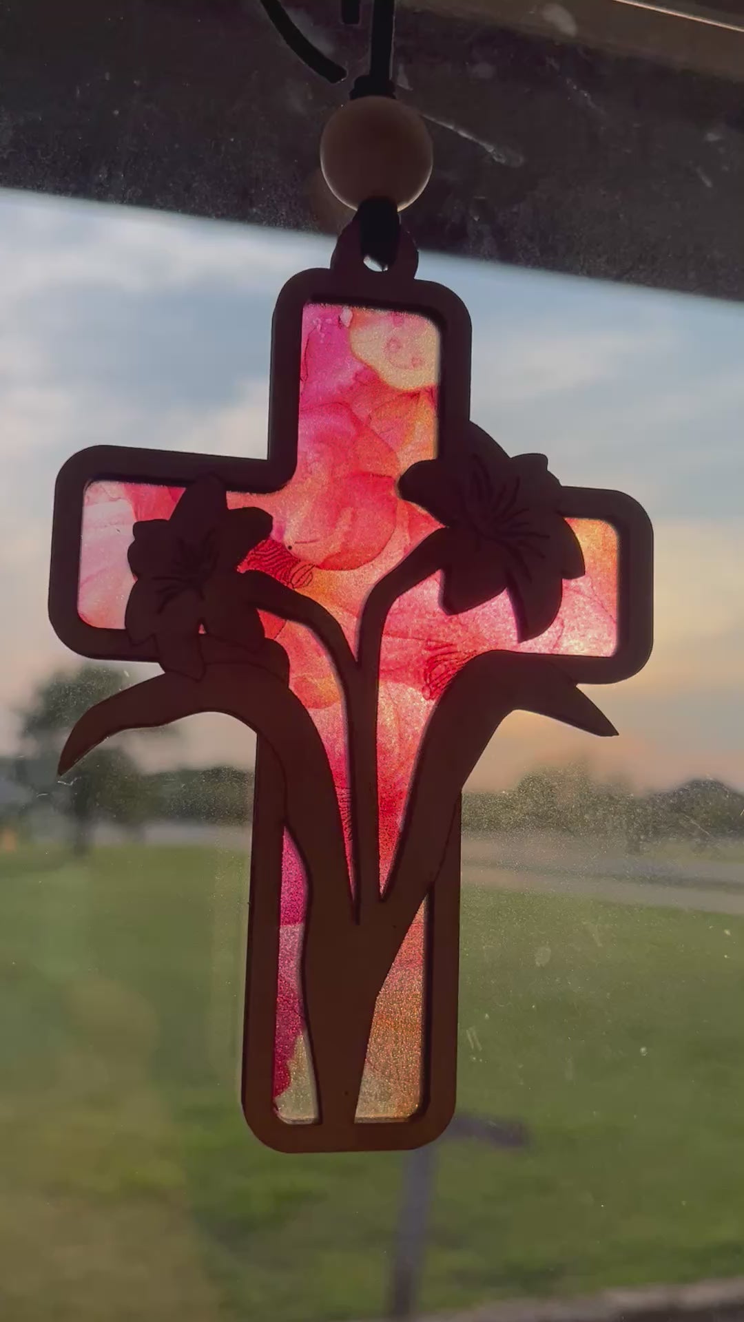 Lily Cross Suncatcher - Multicolor Acrylic & Wood Window Art (5.75 in)