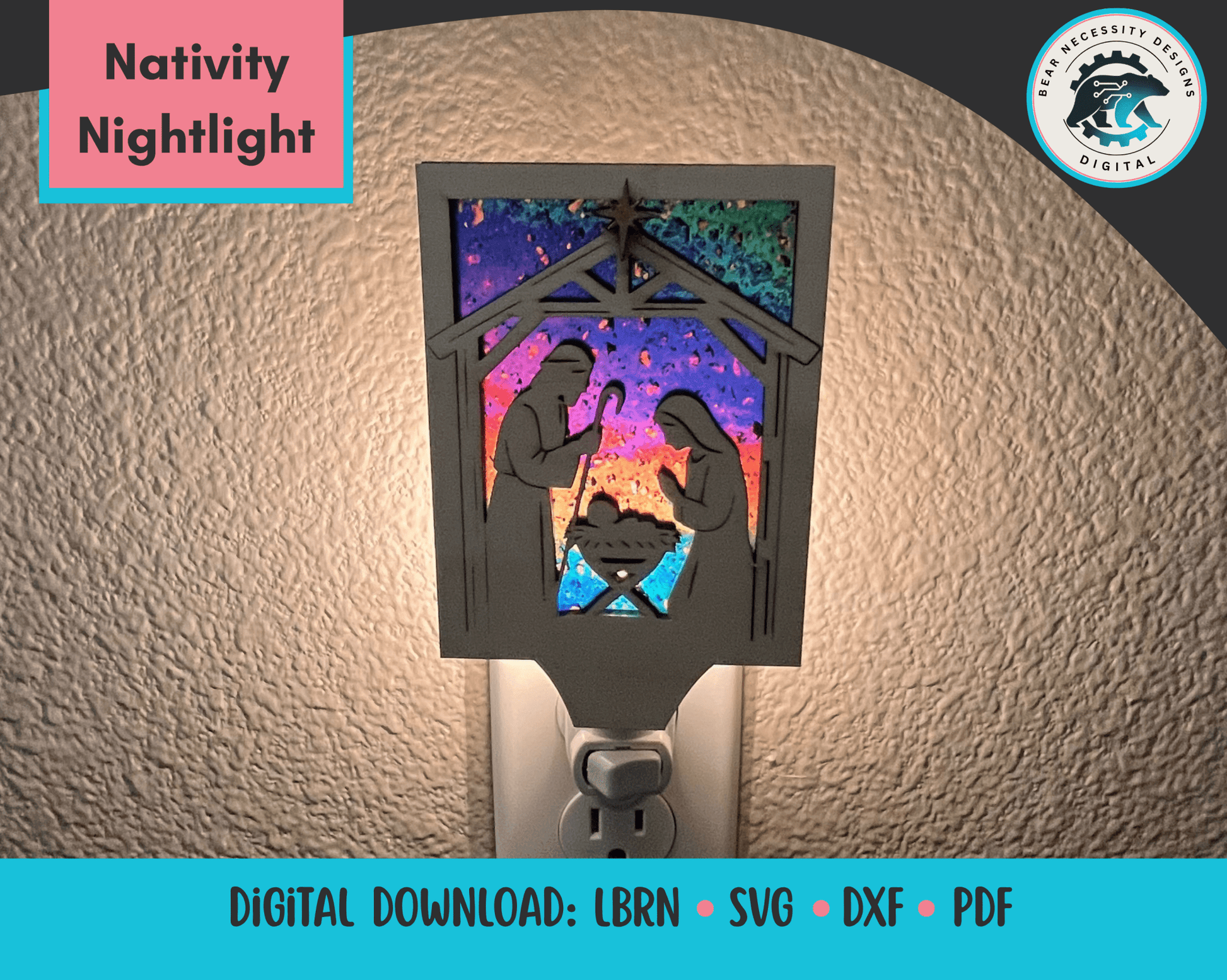 This Nativity Nightlight SVG cut file features the Holy Family in a beautiful framed nightlight design, perfect for glowing Christmas décor and handmade gifts. Designed for LED nightlight modules, this layered file creates a stained-glass-style glow when cut from wood, acrylic, or MDF.
