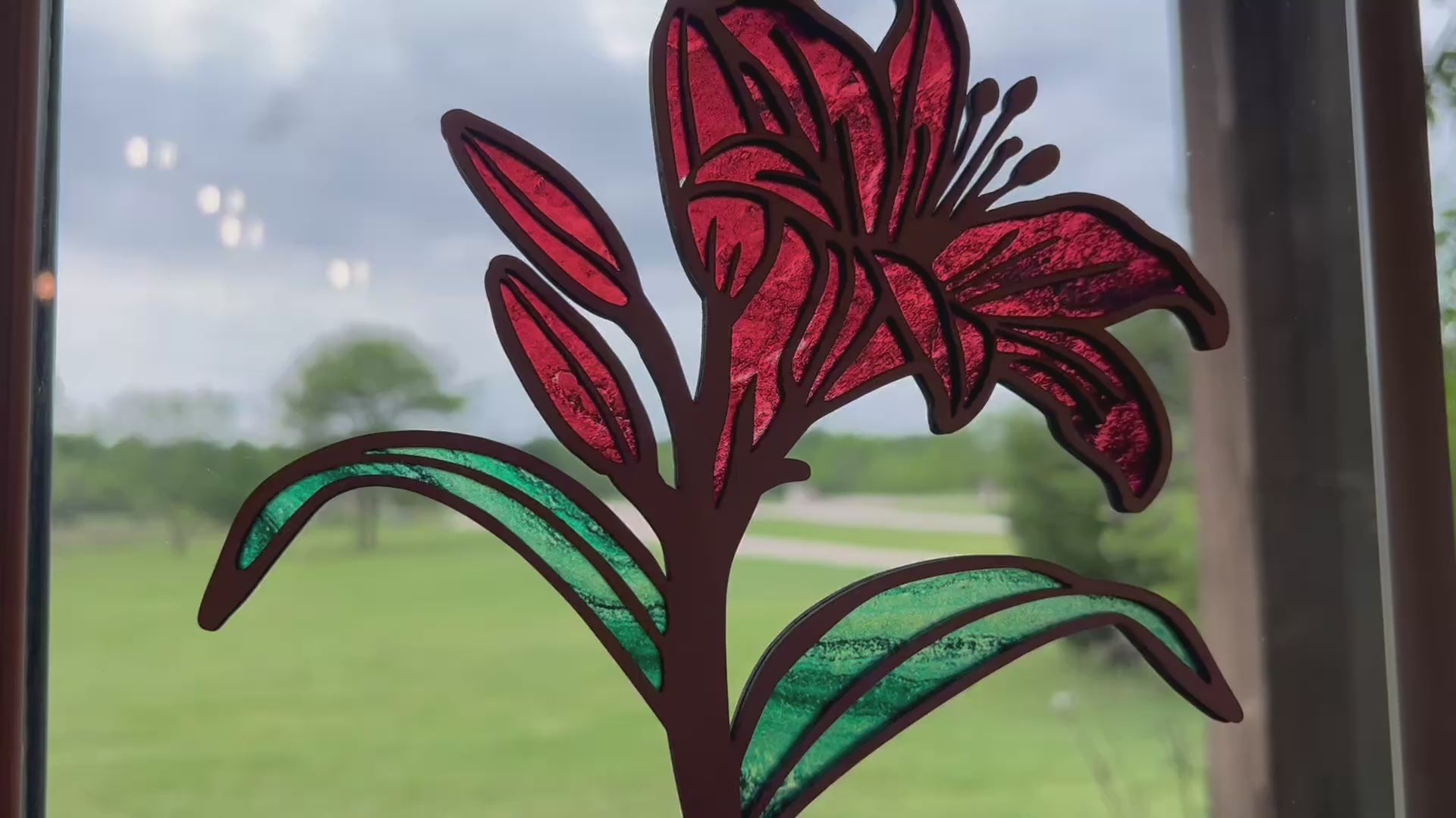 We create each Red Daylily Suncatcher by layering high-quality acrylic and wood to mimic the intricate beauty of stained glass. The result is a dynamic, light-catching piece that plays with shadows and colors, offering a unique visual treat each time sunlight dances through it.